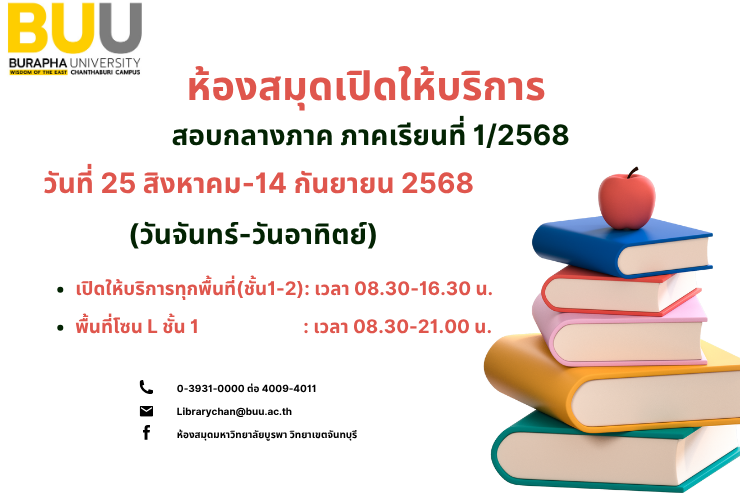 งานห้องสมุด กองบริหารวิทยาเขตจันทบุรี สำนักงานอธิการบดี ขอแจ้งเปิดให้บริการ สอบกลางภาค ภาคเรียนที่ 1 /2568