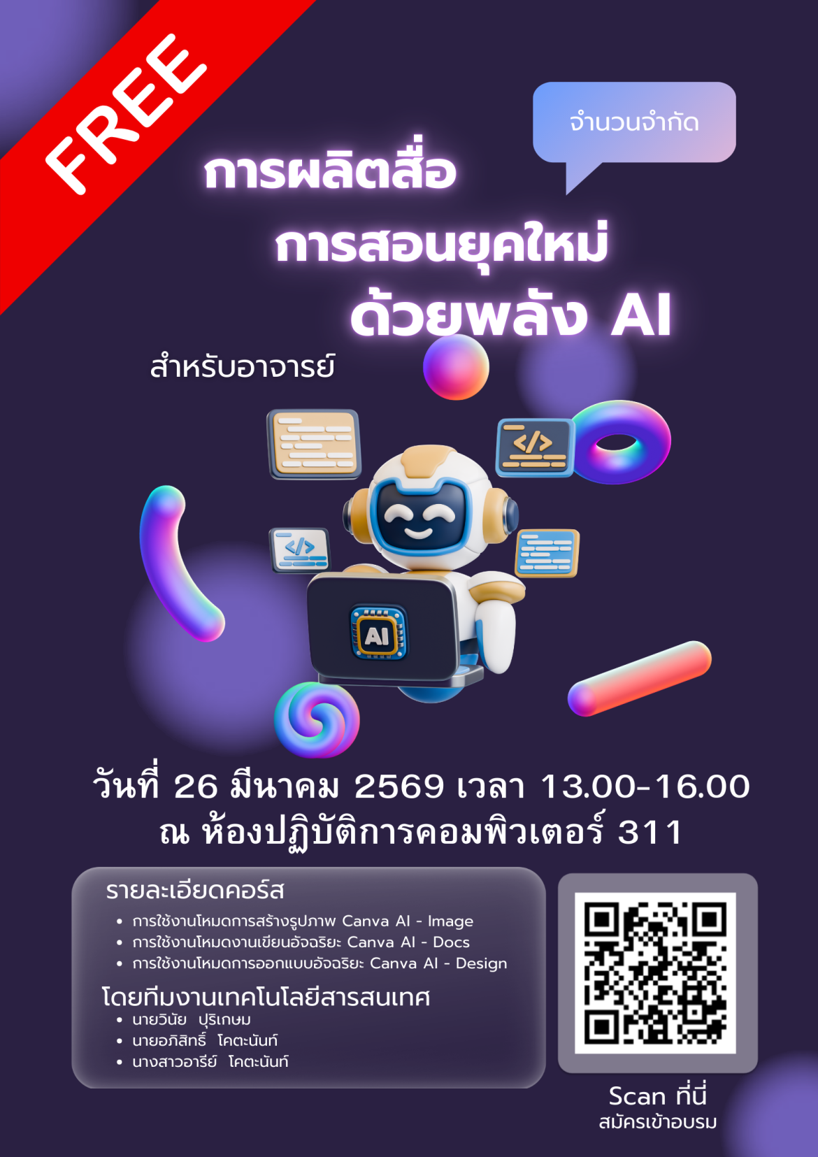 จึงเรียนมาเพื่อโปรดทราบและพิจารณาเข้าร่วมโครงการอบรมเชิงปฏิบัติการ ฯ ตามวัน เวลา และสถานที่ดังกล่าว ทั้งนี้ ขอความกรุณาท่านและผู้ที่สนใจเข้าร่วมโครงการอบรม ฯ สามารถลงทะเบียนได้ที่ https://forms.gle/Qi1xXuDqYvUwt1LWA หรือ แสกน QR Code ภายในวันอังคารที่ 24 มีนาคม พ.ศ. 2569 หรือจนกว่าที่นั่งจะเต็ม
