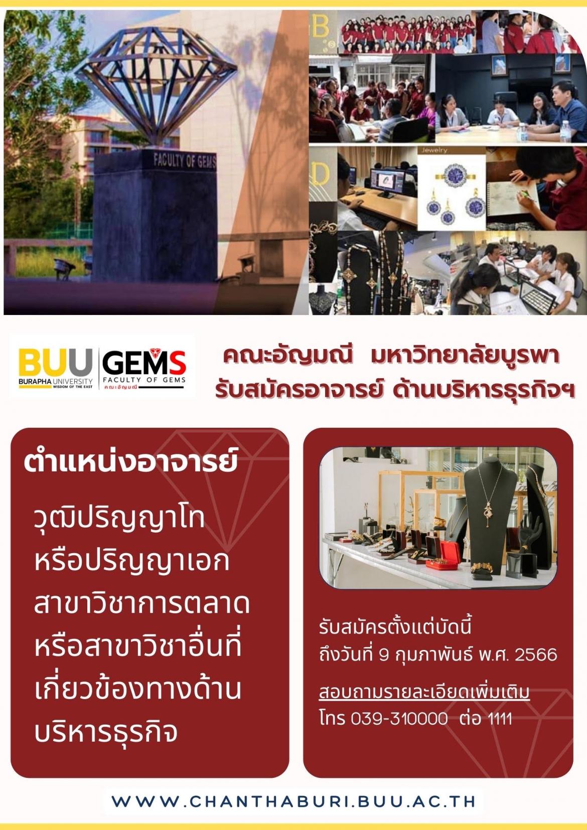 คณะอัญมณี มหาวิทยาลัยบูรพา รับสมัครคัดเลือกบุคคลเพื่อบรรจุเป็นพนักงานมหาวิทยาลัย ซึ่งจ้างด้วยเงินอุดหนุนรัฐบาล สังกัดสำนักงานการศึกษา คณะอัญมณี จำนวน ๑ อัตรา