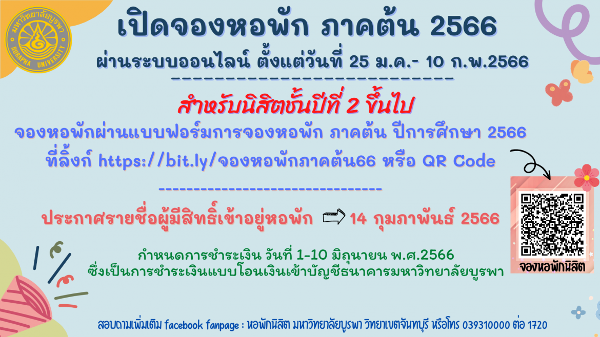 1.จองหอพัก ผ่านระบบออนไลน์ ตั้งแต่วันที่ 25 ม.ค.- 10 ก.พ.2566 ได้ที่นี่ https://bit.ly/จองหอพักภาคต้น66