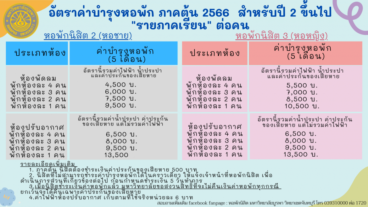 กองบริหารวิทยาเขตจันทบุรี ขอแจ้งกำหนดการจองและชำระเงินค่าหอพัก ภาคต้น ปีการศึกษา 2566 สำหรับนิสิตชั้นปีที่ 2 ขึ้นไป ดังนี้