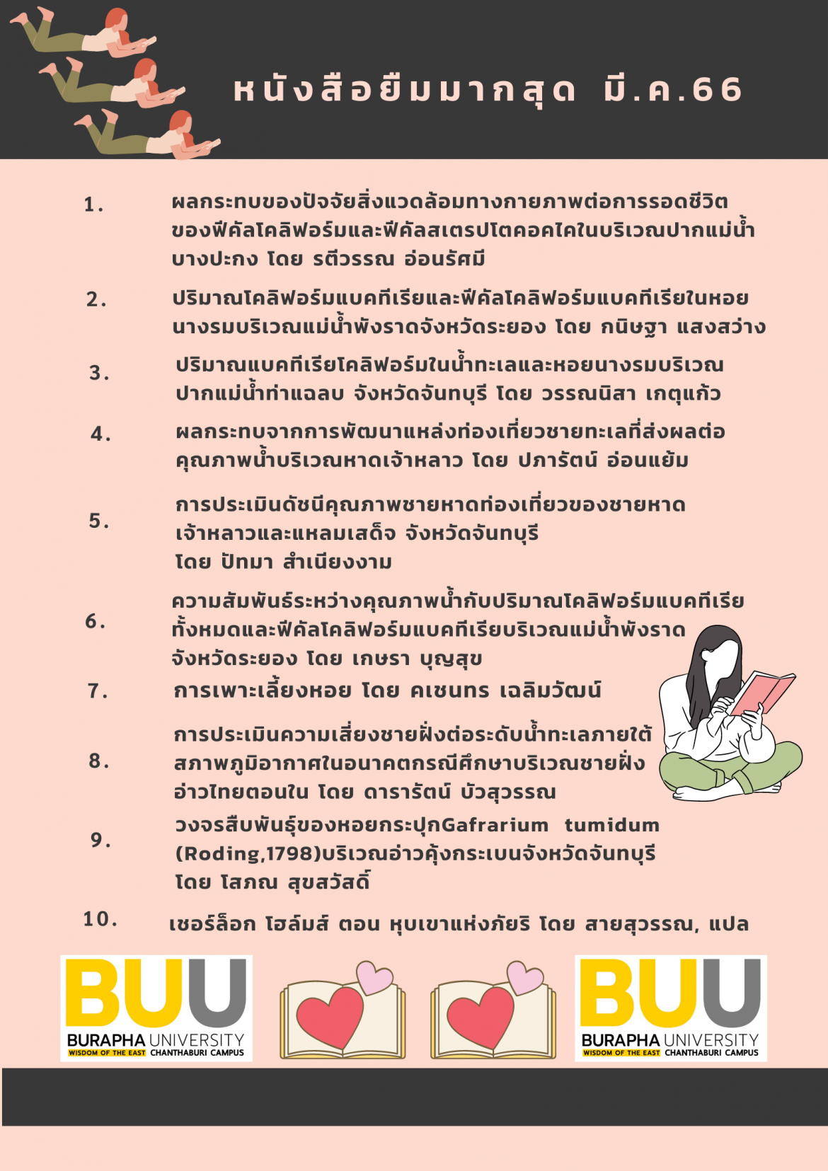 งานห้องสมุด กองบริหารวิทยาเขตจันทบุรี มหาวิทยาลัยบูรพา ขอแจ้งรายชื่อ 10 อันดับ หนังสือที่ถูกยืมมากที่สุด ประจำเดือน มีนาคม พ.ศ.2566