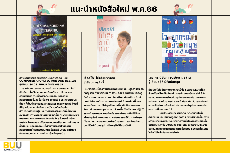 งานห้องสมุด กองบริหารวิทยาเขตจันทบุรี มหาวิทยาลัยบูรพา ขอแจ้งรายชื่อหนังสือใหม่ ประจำเดือน พฤษภาคม พ.ศ. 2566