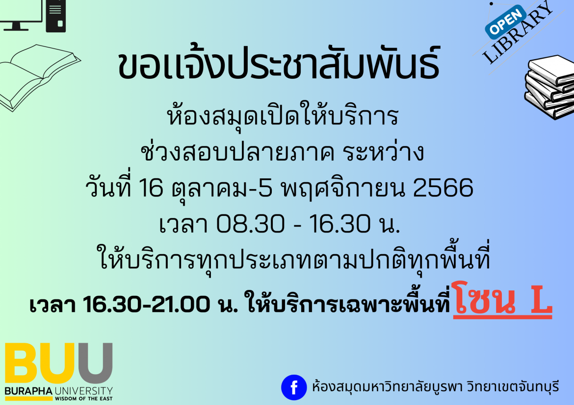 ห้องสมุดเปิดให้บริการช่วงสอบกลางภาค ระหว่าง วันที่ 16 ตุลาคม - 5 พฤศจิกายน 2566 เวลา 08.30 - 16.30 น.ให้บริการทุกประเภทตามปกติทุกพื้นที่ เวลา 16.30-21.00 น. ให้บริการเฉพาะพื้นที่ โซน L