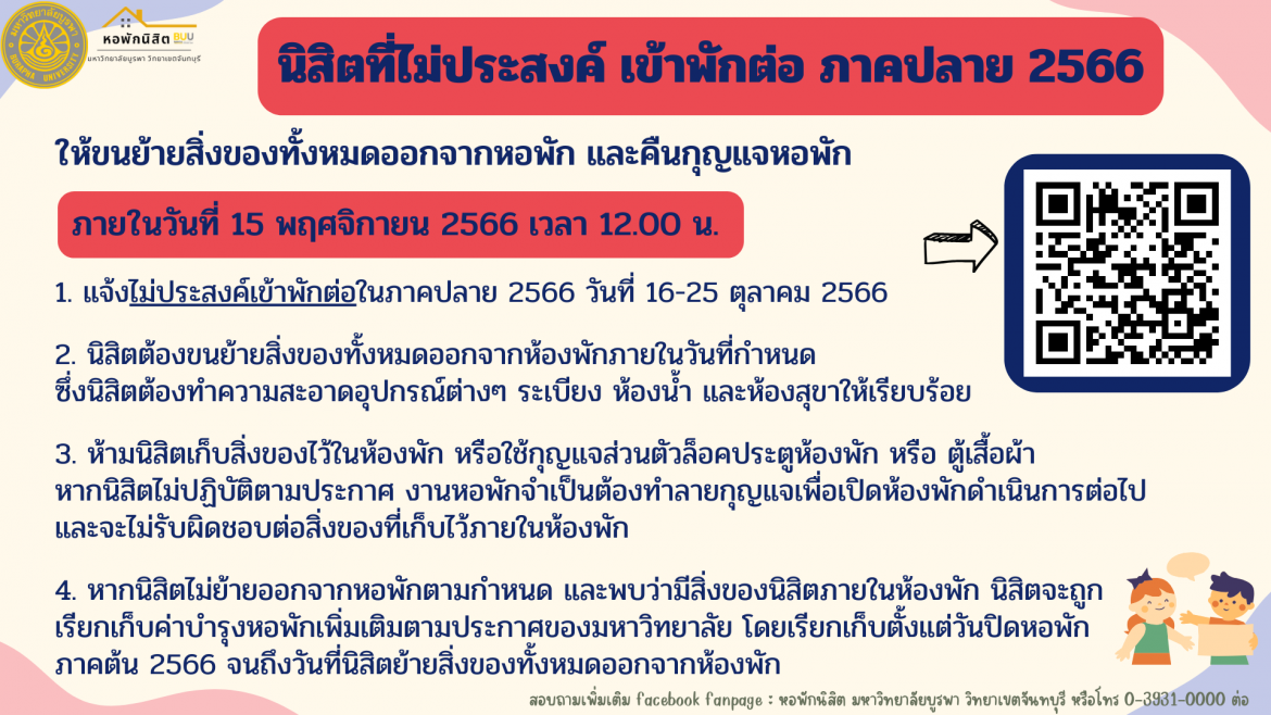 นิสิตที่ไม่ได้จองหอพักภาคปลาย 2566 ต้องดำเนินการขนย้ายสิ่งของออกทั้งหมดภายในวันที่ 15 พ.ย.2566 เวลา 12.00 น.