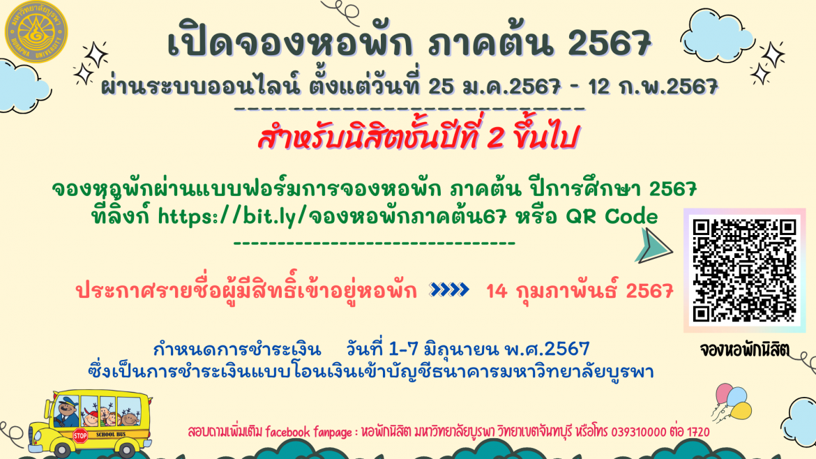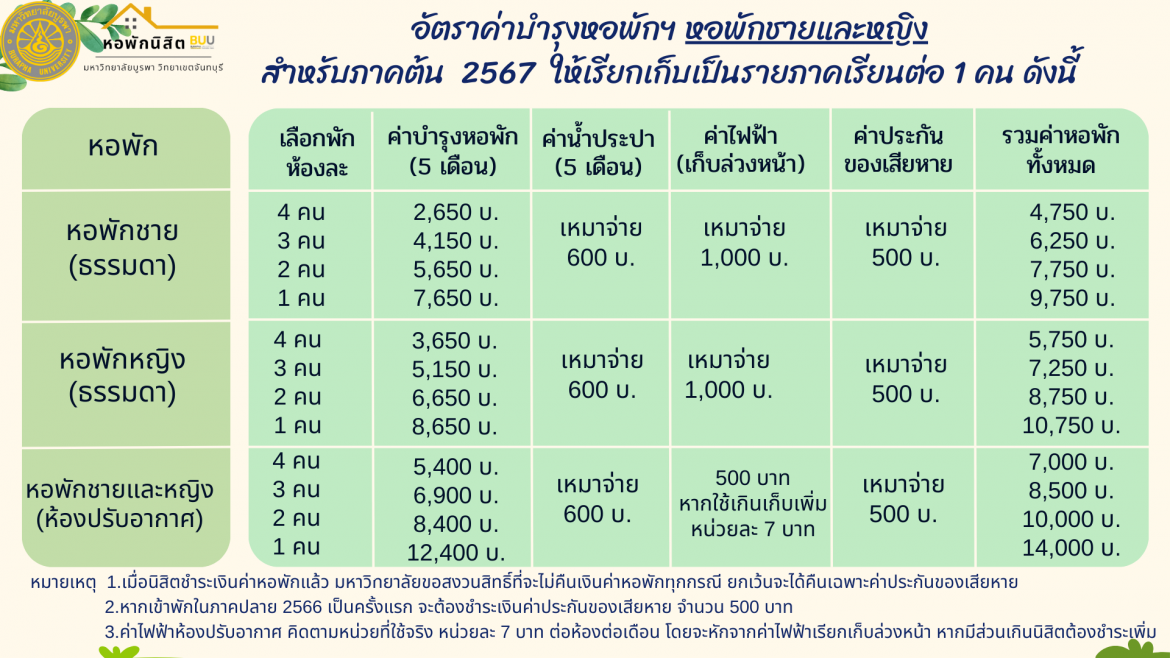 ติดต่อสอบถามเพิ่มเติม : งานหอพักนิสิต กองบริหารวิทยาเขตจันทบุรี มหาวิทยาลัยบูรพา โทร.039-310000 ต่อ 1720