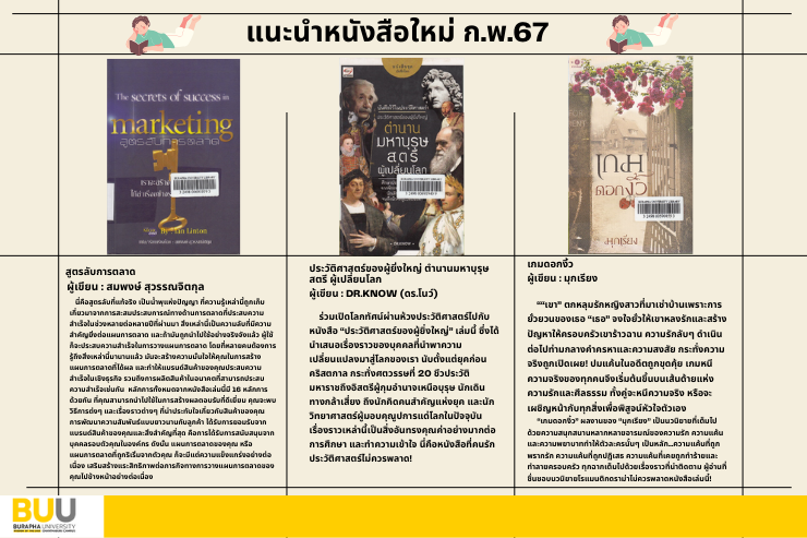 งานห้องสมุด กองบริหารวิทยาเขตจันทบุรี มหาวิทยาลัยบูรพา ขอแจ้งรายชือหนังสือใหม่ ประจำเดือน กุมภาพันธ์ พ.ศ. 2567
