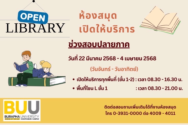 ห้องสมุดเปิดให้บริการช่วงสอบปลายภาค ระหว่าง วันที่ 22 มีนาคม - 4 เมษายน 2568 เวลา