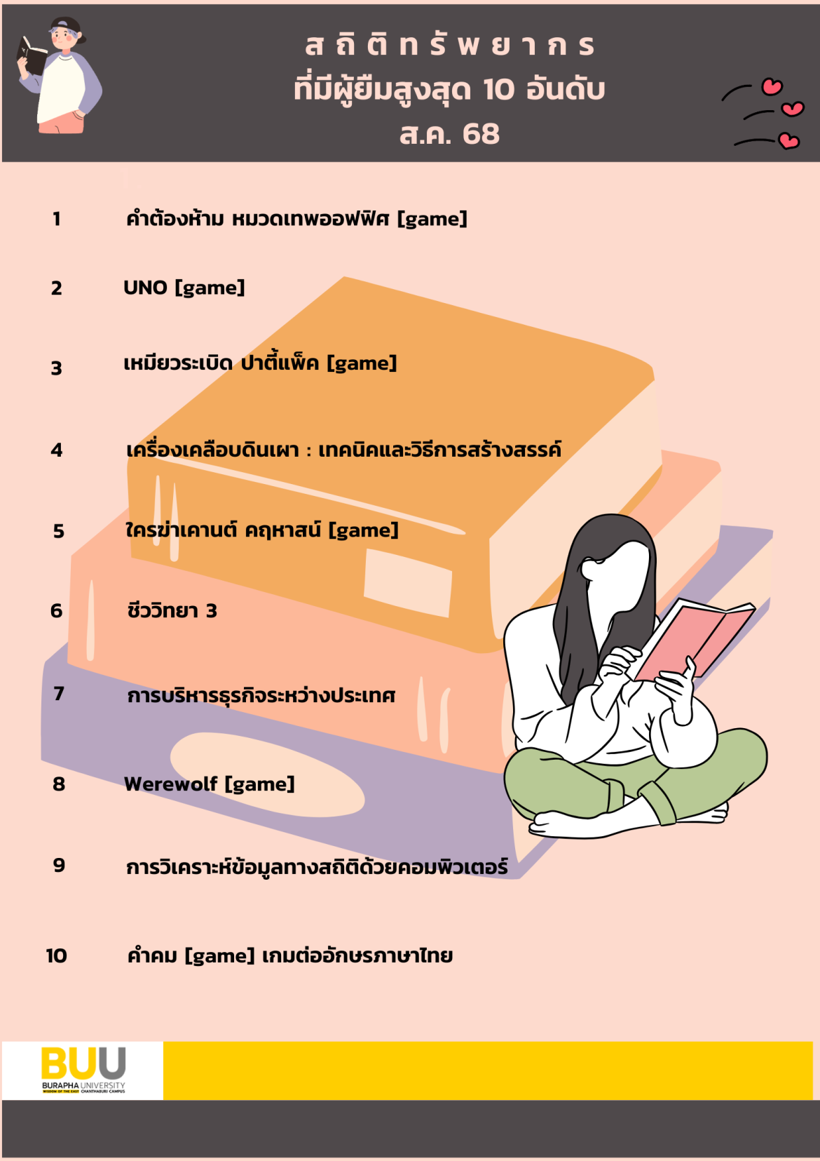 งานห้องสมุด กองบริหารวิทยาเขตจันทบุรี มหาวิทยาลัยบูรพา ขอแจ้งรายชื่อสถิติทรัพยากรที่มีผู้ยืมสูงสุด 10 อันดับ ประจำเดือน สิงหาคม พ.ศ.2568