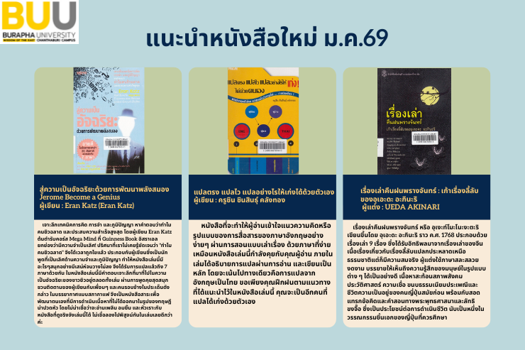 งานห้องสมุด กองบริหารวิทยาเขตจันทบุรี มหาวิทยาลัยบูรพา ขอแจ้งรายชื่อ หนังสือใหม่ ประจำเดือน มกราคม พ.ศ. 2569