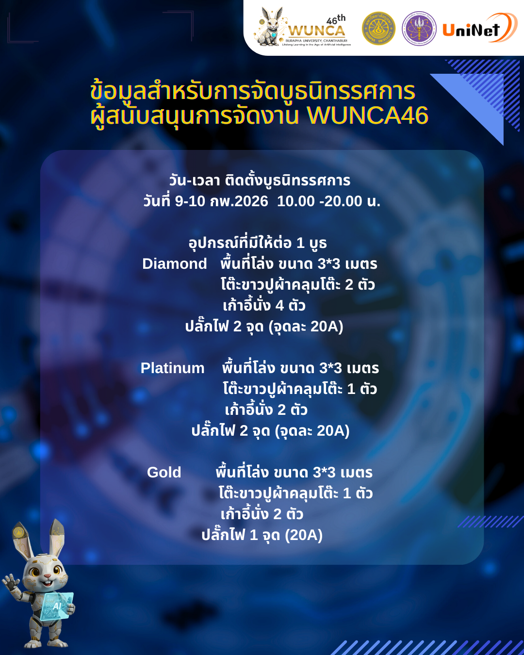 ดูแผนผังการจัดงาน ที่ https://wunca46.uni.net.th/sponsor