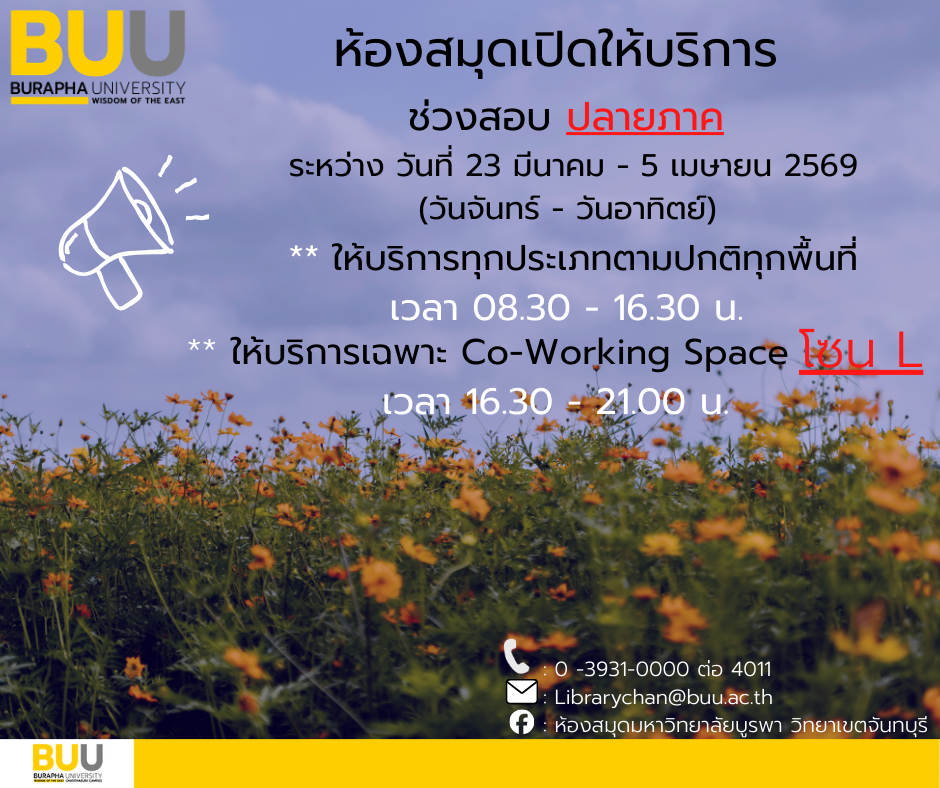 งานห้องสมุด กองบริหารวิทยาเขตจันทบุรี สำนักงานอธิการบดี ขอแจ้งห้องสมุด เปิดให้บริการช่วงสอบปลายภาค วันจันทร์ – วันอาทิตย์