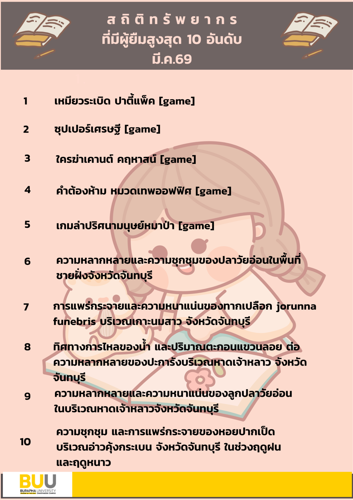 งานห้องสมุด กองบริหารวิทยาเขตจันทบุรี มหาวิทยาลัยบูรพา ขอแจ้งรายชื่อ สถิติทรัพยากรที่มีผู้ยืมสูงสุด 10 อันดับ ประจำเดือน มีนาคม พ.ศ.2569