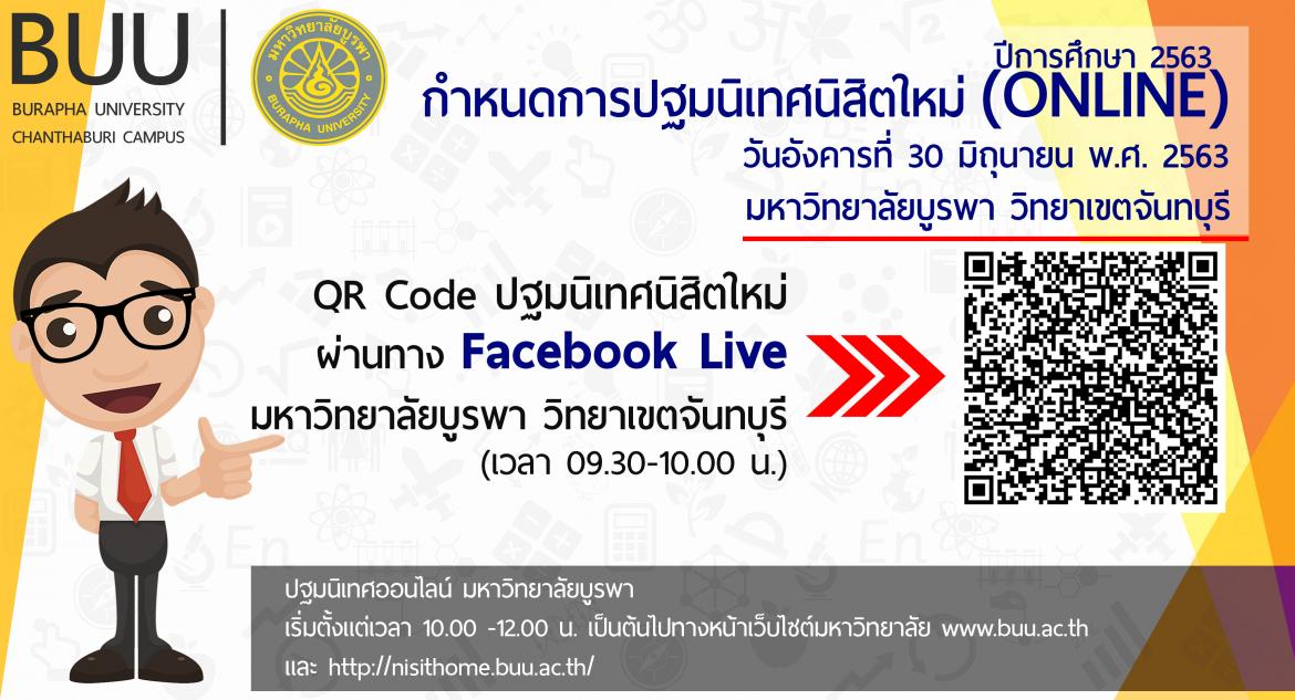 กำหนดการปฐมนิเทศนิสิตใหม่ ปีการศึกษา 2563 (ONLINE) มหาวิทยาลัยบูรพา วิทยาเขตจันทบุรี วันอังคารที่ 30 มิถุนายน พ.ศ. 2563 ตั้งแต่เวลา 09.30-10.00 น. โดยถ่ายทอดสดผ่านทาง Facebook Live เพจ มหาวิทยาลัยบูรพา วิทยาเขตจันทบุรี