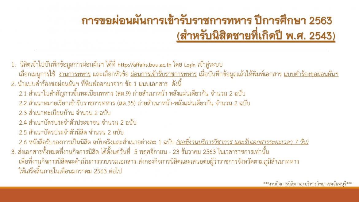 3. ส่งเอกสารทั้งหมดที่งานกิจการนิสิต ได้ตั้งแต่วันที่ 5 พฤศจิกายน - 23 ธันวาคม 2563 ในเวลาราชการเท่านั้น เพื่อที่งานกิจการนิสิตจะดำเนินการรวบรวมเอกสาร ส่งกองกิจการนิสิตและเสนอต่อผู้ว่าราชการจังหวัดตามภูมิลำเนาทหาร ให้เสร็จสิ้นภายในเดือนมกราคม 2563 ต่อไป