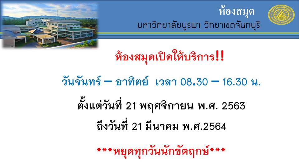 ห้องสมุดเปิดให้บริการทุกวัน วันที่ 21 พ.ย.63 - 21 มี.ค.64