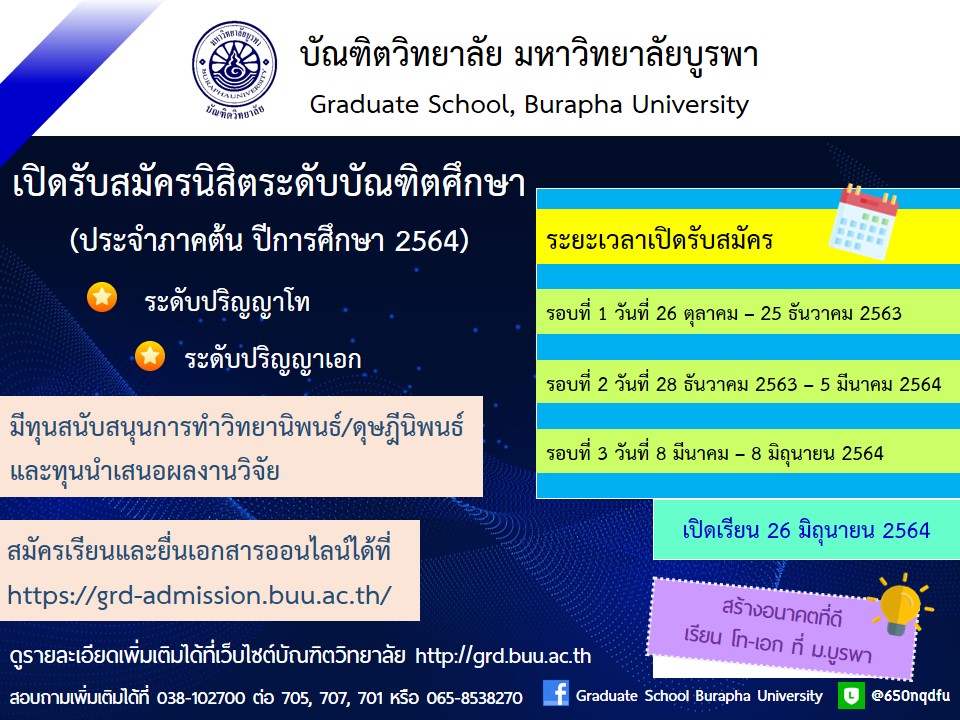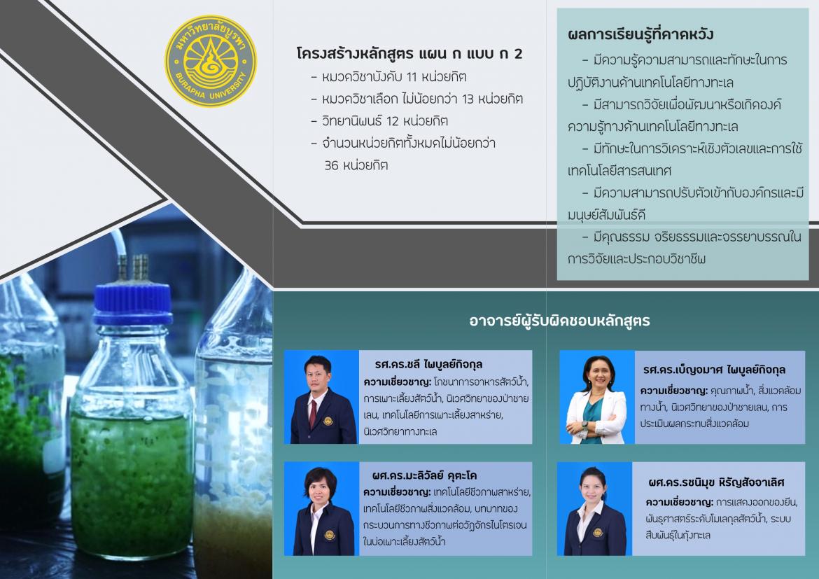 หลักสูตรวิทยาศาสตรมหาบัณฑิต สาขาวิชาเทคโนโลยีทางทะเล มหาวิทยาลัยบูรพา วิทยาเขตจันทบุรี เปิดรับสมัครนิสิตใหม่ ตั้งแต่วันนี้ถึงวันที่ 5 มีนาคม 2564 การเเรียนสอน : วันเสาร์-วันอาทิตย์