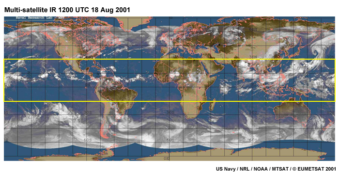 Riehl and Malkus (1958)1 hypothesized that the upward transport of energy into the upper troposphere is concentrated in deep convective weather systems, such as the intermittent band of systems outlined by the yellow line in Fig. 1.5. They estimated that between 1500 and 5000 deep cumuli were needed to balance the global heat budget. The upward motion in these convective cores, referred to as “hot towers”, is balanced by downward motion in the space between the clouds.