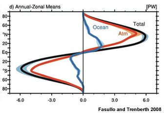 - Describe the relative contributions and difference between the meridional transport by the ocean and the atmosphere.